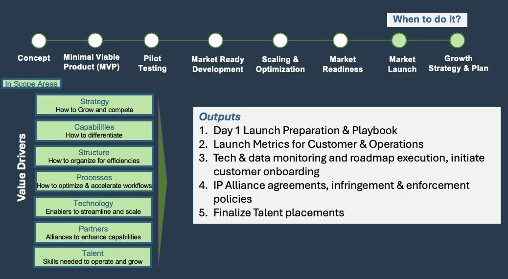 Why this is needed: Creating a responsive and adaptable business model will allow businesses to grow and penetrate markets. Being ready for market launch Day 1 is critical to manage technology, IP and operations to ensure success.